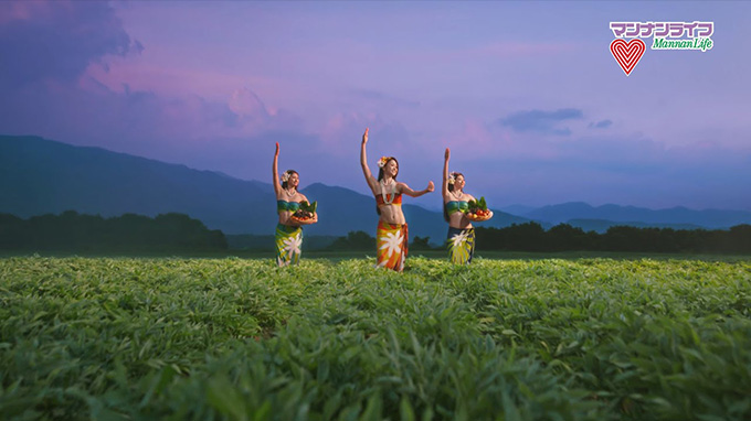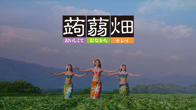 - 蒟蒻畑でフルーツと~れ~た~♪でおなじみの蒟蒻畑のCMは、群馬県のこんにゃくの畑で撮影。おなかをつまむシーンが印象的で、商品の特性をストレートに伝え、若い女性を中心に人気が出た。