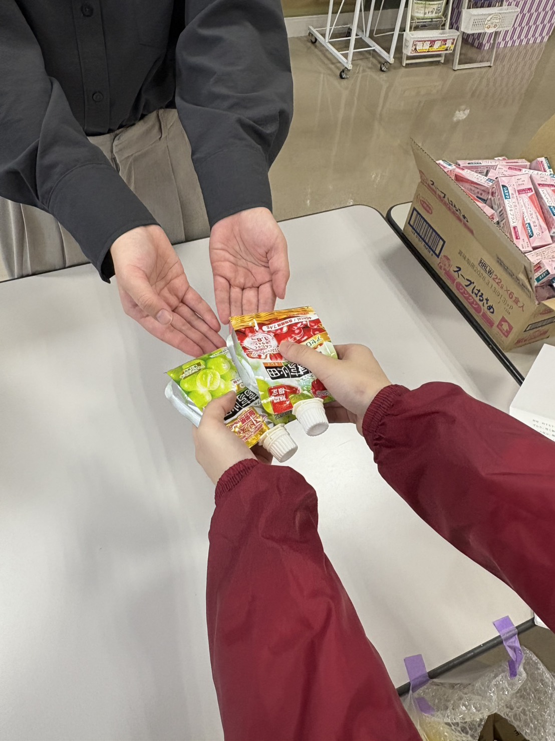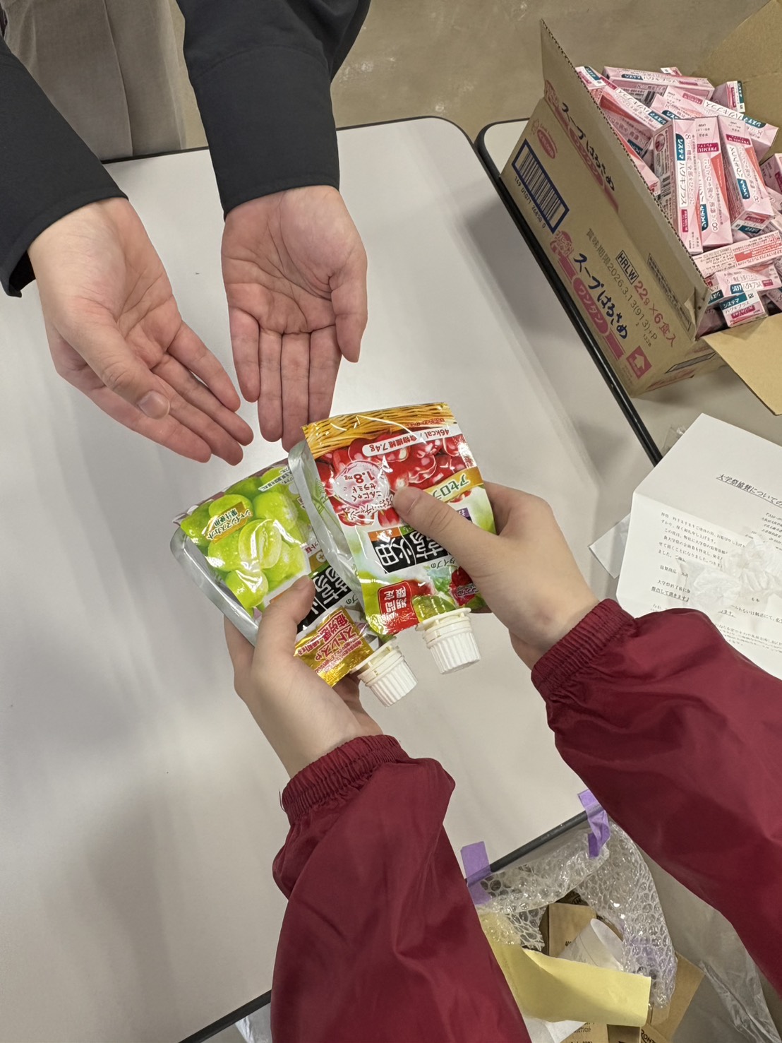 - 商品配布状況:今回ご提供いただいた商品は抽選会・縁日・スタンプラリーでの景品にて使用させていただきました。蒟蒻畑は誰もが知っているこんにゃくゼリーであることから多くの人に喜ばれ、特にシャインマスカット味は最近人気が急上昇し、とても人気が高い味です。また、今回提供していただいたものは1口サイズのものではなく、吸いながら食べるタイプのものであり、満足感も高かったです。 そのため複数のお菓子類を景品として使用させていただいていましたが、圧倒的な人気でなくなってしまうほどでした。