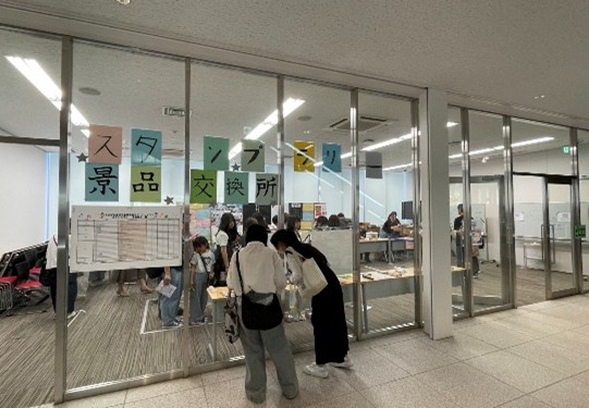 - 商品配布状況:いただいたご協賛品は、スタンプラリー企画の景品として使用させていただきました。 スタンプラリーには開催日2日間で1359人もの来場者に参加していただき、ご参加いただいた皆様に様々な景品を提供いたしました。当企画では、在学生のみならずご来場いただいた全ての皆様に楽しんでいただき、貴社からいただいたご協賛品も景品として全て配布いたしました。 協賛いただいた「クラッシュタイプの蒟蒻畑 プラス シャインマスカット味」は既に多くの方に馴染みのある人気商品であり、受け取った方々からは「蒟蒻畑、好きでよく買っているので嬉しいです!」、「好きな味でありがたかったです。」などの声があがっていて、大変好評を博しておりました。中高生や受験生、保護者の方々にも喜ばれ、老若男女を問わない商品であったため、貴社の商品が、本学園祭を幅広い方々に楽しんでいただける要素の一つになったと感じております。