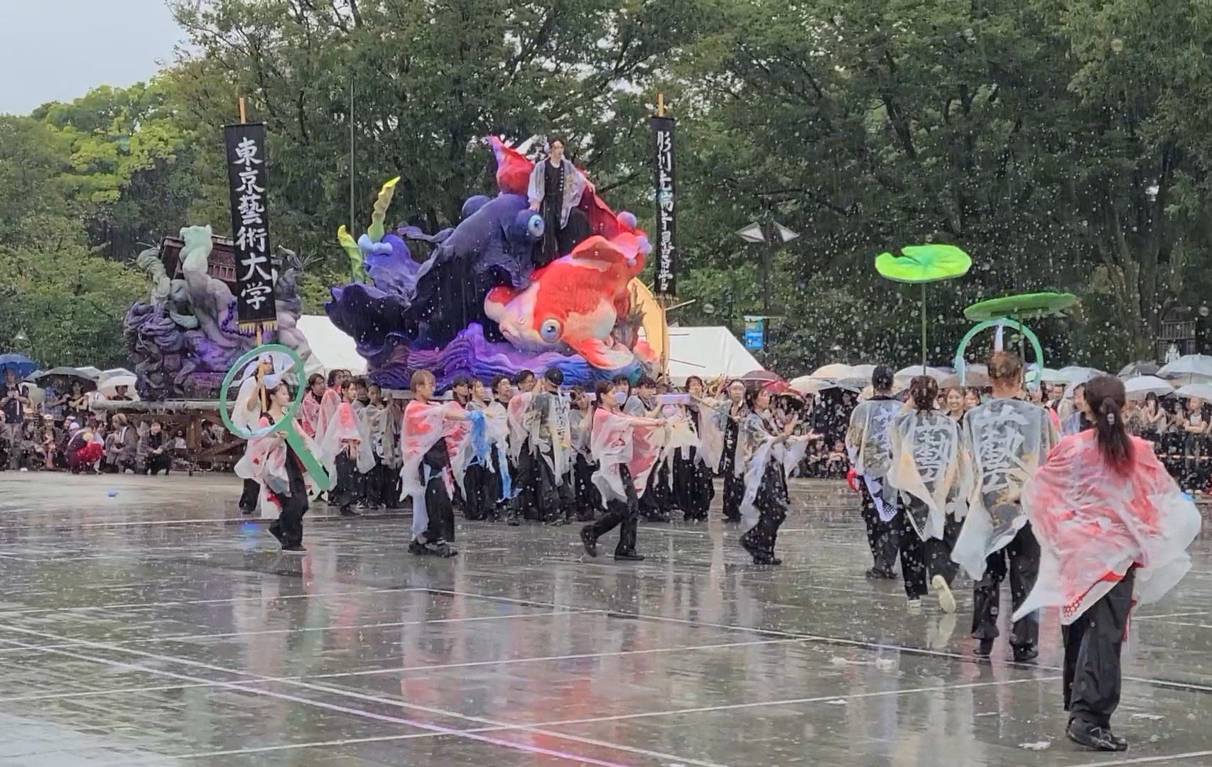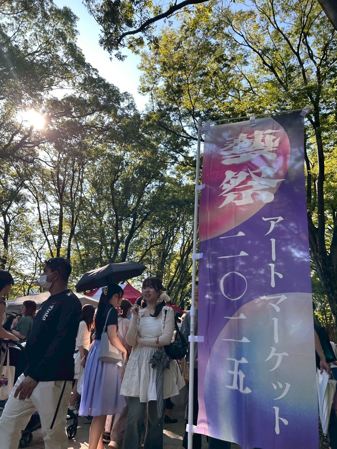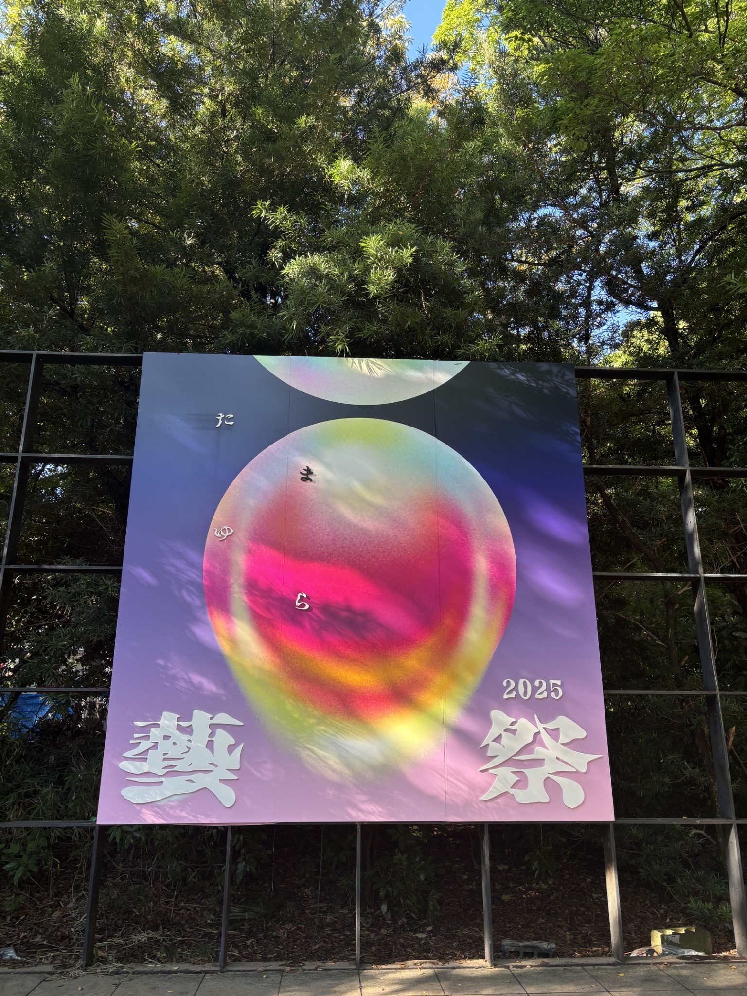 - 大学祭コメント:例年たくさんの方にご来場いただく藝祭ですが、今年度も大変盛り上がる藝祭となりました。一昨年度までコロナ等の影響で規模を縮小しておりましたが、昨年度完全復活を 果たし、今年度はさらにアトマ店舗数等の増加や各種イベント、コラボ企画など熱気あふれる3日間となりました。 1日目は荒天に見舞われ一時開催が危ぶまれましたが、2・3日目はうって変わって良い天気で本番を迎えることができ、延べ8万人という大変多くの方にご来場いただくことができました。 今年度の開口一番は土砂降りの雨の中迎えることとなりました。悪天候の中でしたが、藝大1年生がひと夏をかけてつくりあげた大迫力の御輿とパフォーマンスを、多くの方にご覧いただきました。 コロナ明け以降、年々学内の応募団体が増加しており、今年度も多様な展示・演奏会や模擬店が開かれました。また、今年度は野外ステージのゲストにロバート秋山竜次氏、日食なつこ氏をお呼びし、それぞれトークショーと生演奏をご披露いただきました。野外ステージの観客席から人があふれるほどの大変な盛況でした。 今年度より新たに、藝祭の閉会式として「グランドフィナーレ」を実施いたしました。 グランドフィナーレでは、藝祭2025のテーマソング「Mirage」の生演奏や、模擬店の売り上げコンテストの結果発表、法被コレクションの授賞式など盛りだくさんで、大盛況の中、藝祭を締めくくりました。 藝祭の3日間を通して、さまざまなハプニングも交えながらではありましたが無事盛況のうちに幕を閉じることができ、ご来場いただいたみなさまにご満足いただける藝祭をつくることができたと感じております。