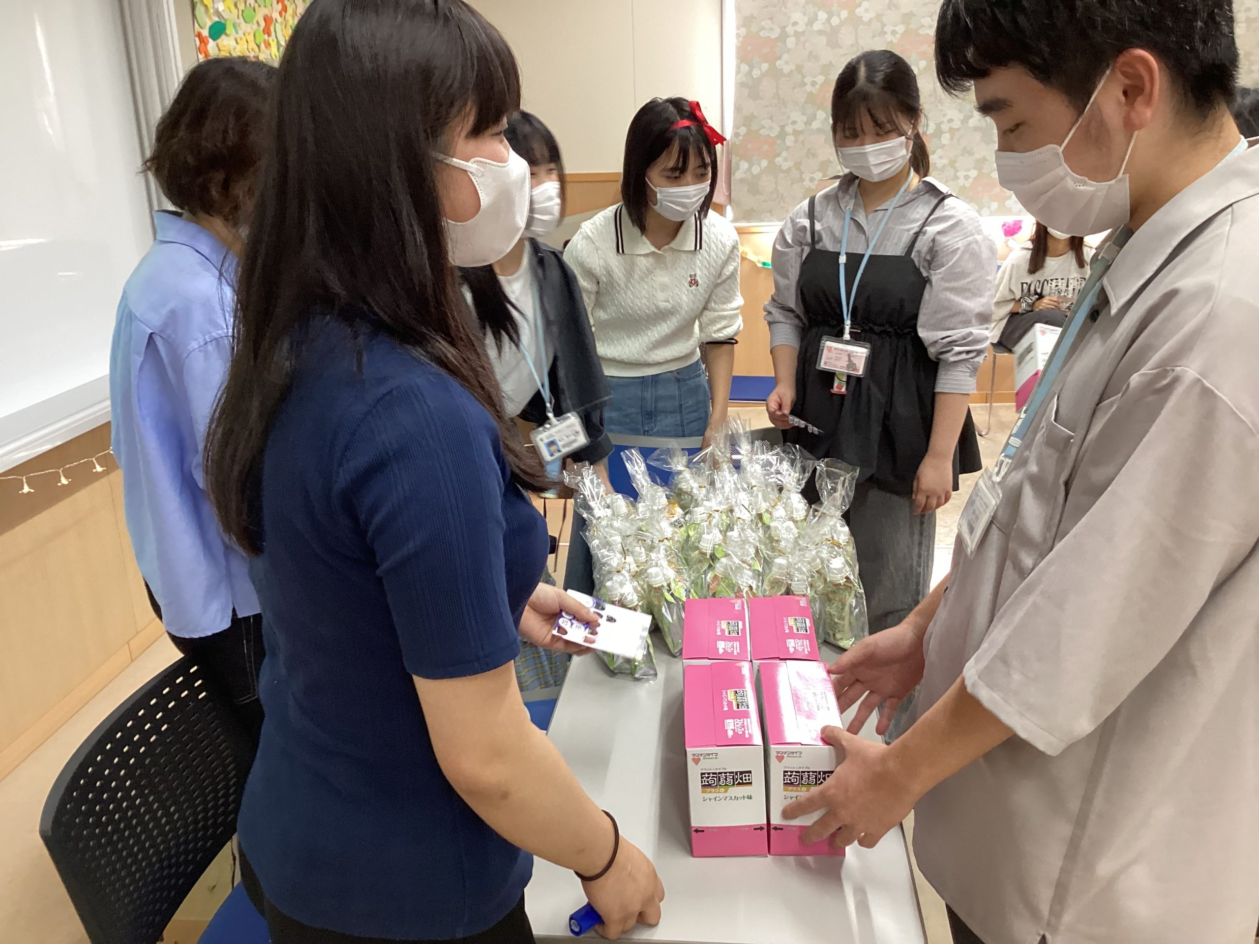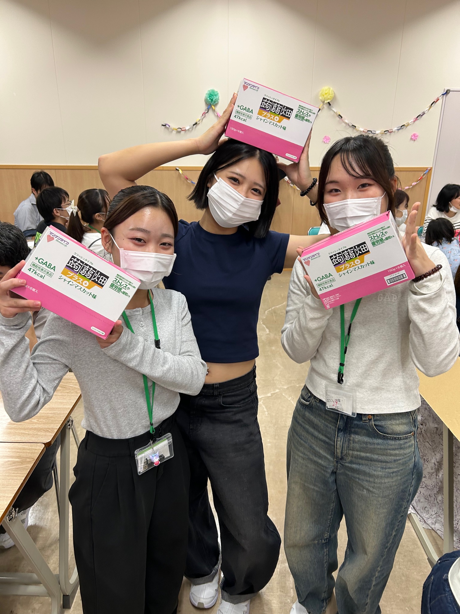- 商品配布状況:蒟蒻畑クラッシュタイプ120個を花粋祭のビンゴゲームの景品として使わせていただきました。すべての提供品を参加者に渡すことができました。景品獲得した参加者は笑顔で写真にあるように皆さん嬉しそうに受け取っておられました。ほとんどが在学生で20歳前後の男女です。一部、在学生の家族が受け取っていました。その他、ヨガ教室で蒟蒻畑は腸活にも効果的であることをPRさせていただき、ビンゴゲームに参加して蒟蒻畑クラッシュタイプを獲得してくださいとお伝えしました。