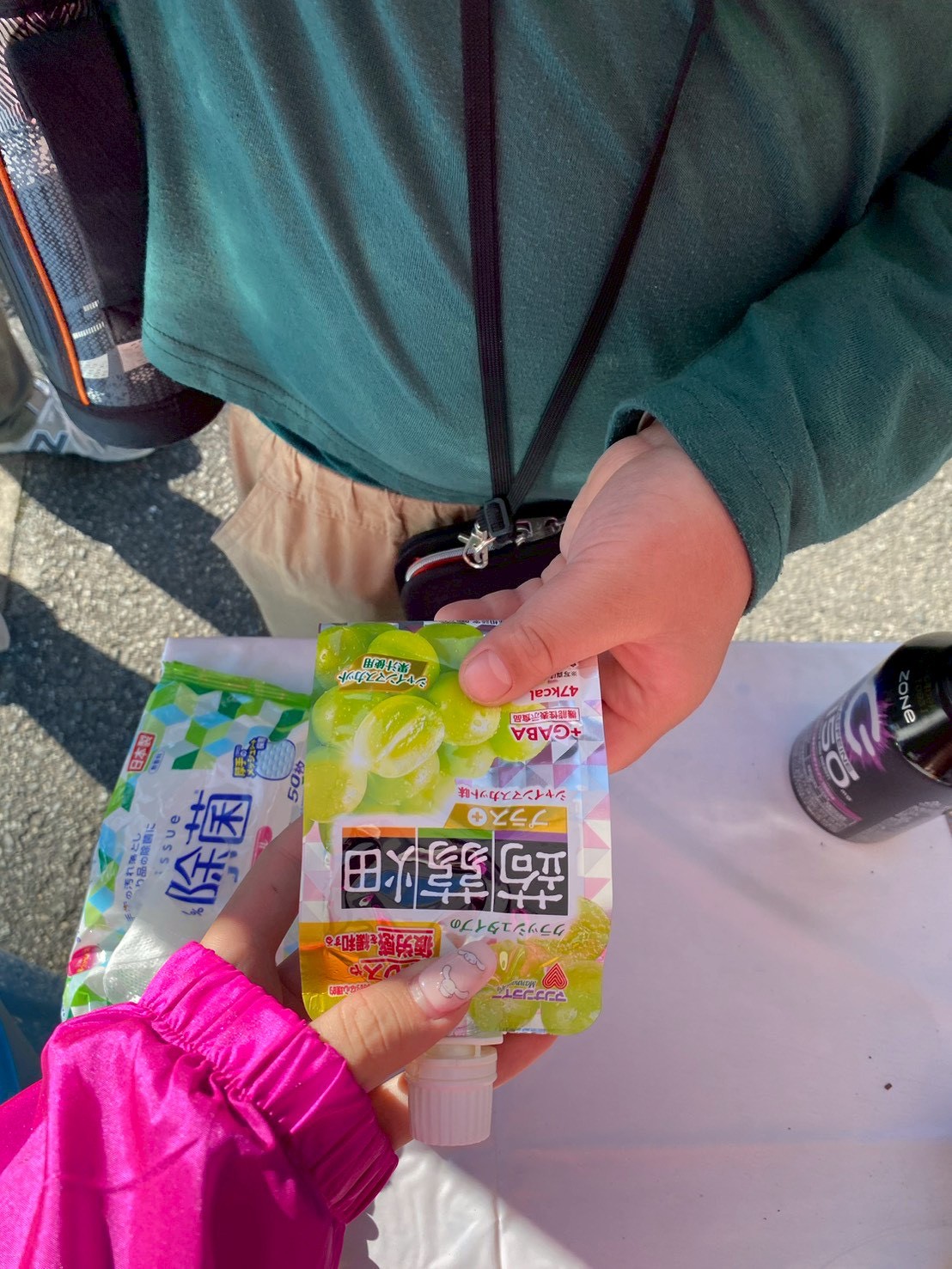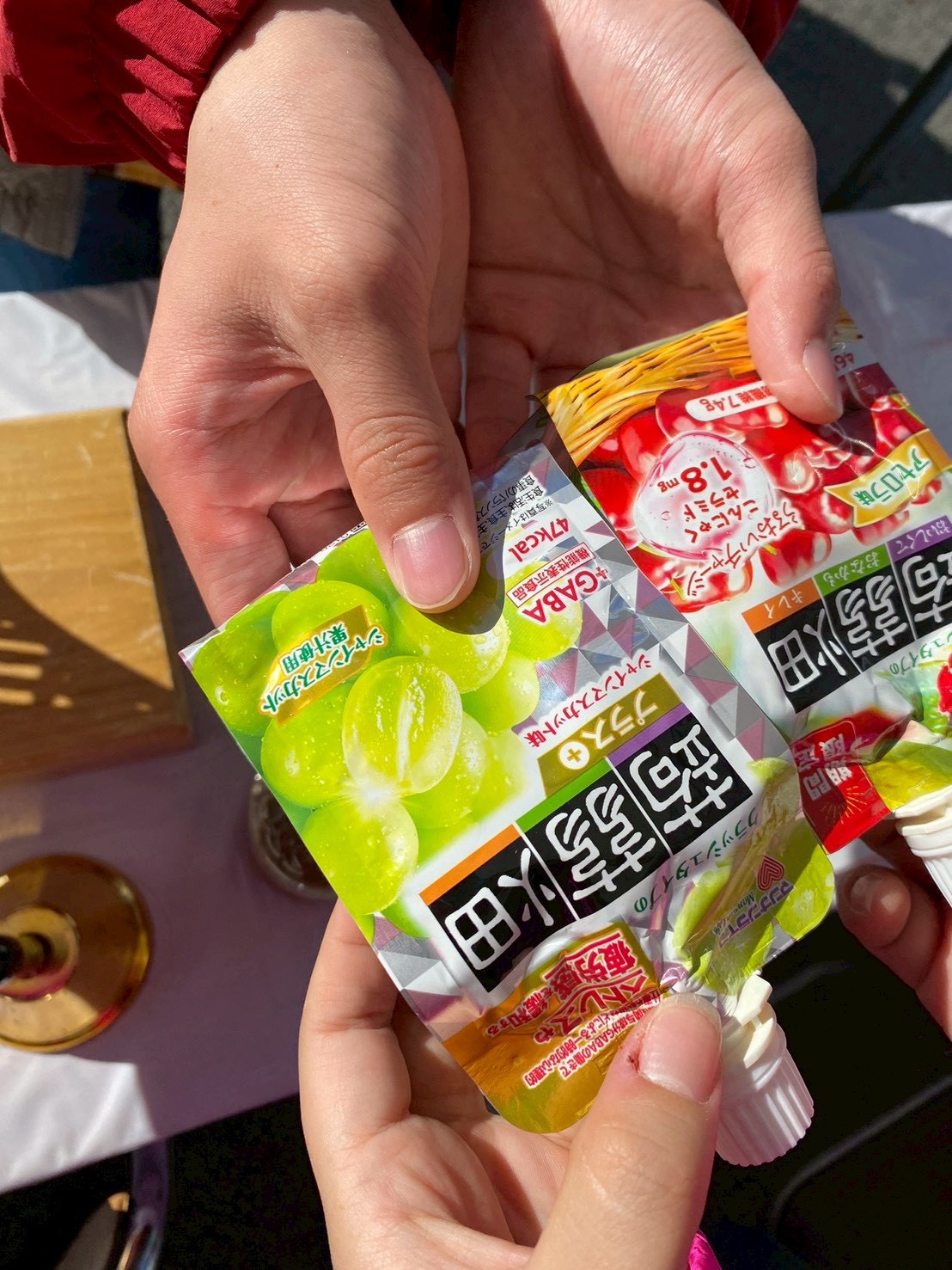 - 商品配布状況:スタンプラリー」「子供企画」「来場者アンケート」「研究発表展」の景品として来場者の皆さまに配布いたしましたクラッシュタイプの蒟蒻畑(シャインマスカット・アセロラ)につきましては、いただいた分を全て無事に配布し終えることができました。 「スタンプラリー」と「来場者アンケート」では、協賛品をすべて並べ来場者に自由に選んでいただきましたが、小さなお子さまからご年配の方まで幅広い年代の方々に手に 取っていただき、他企業の協賛品と比べても早いペースでなくなっていきました。特にシャインマスカットは非常に人気が高く、約3人に2人の割合で選ばれるなど、たいへん 好評をいただきました。今回の企画を通じて、多くの方に喜ばれる景品として大変ありがたく活用させていただきました。