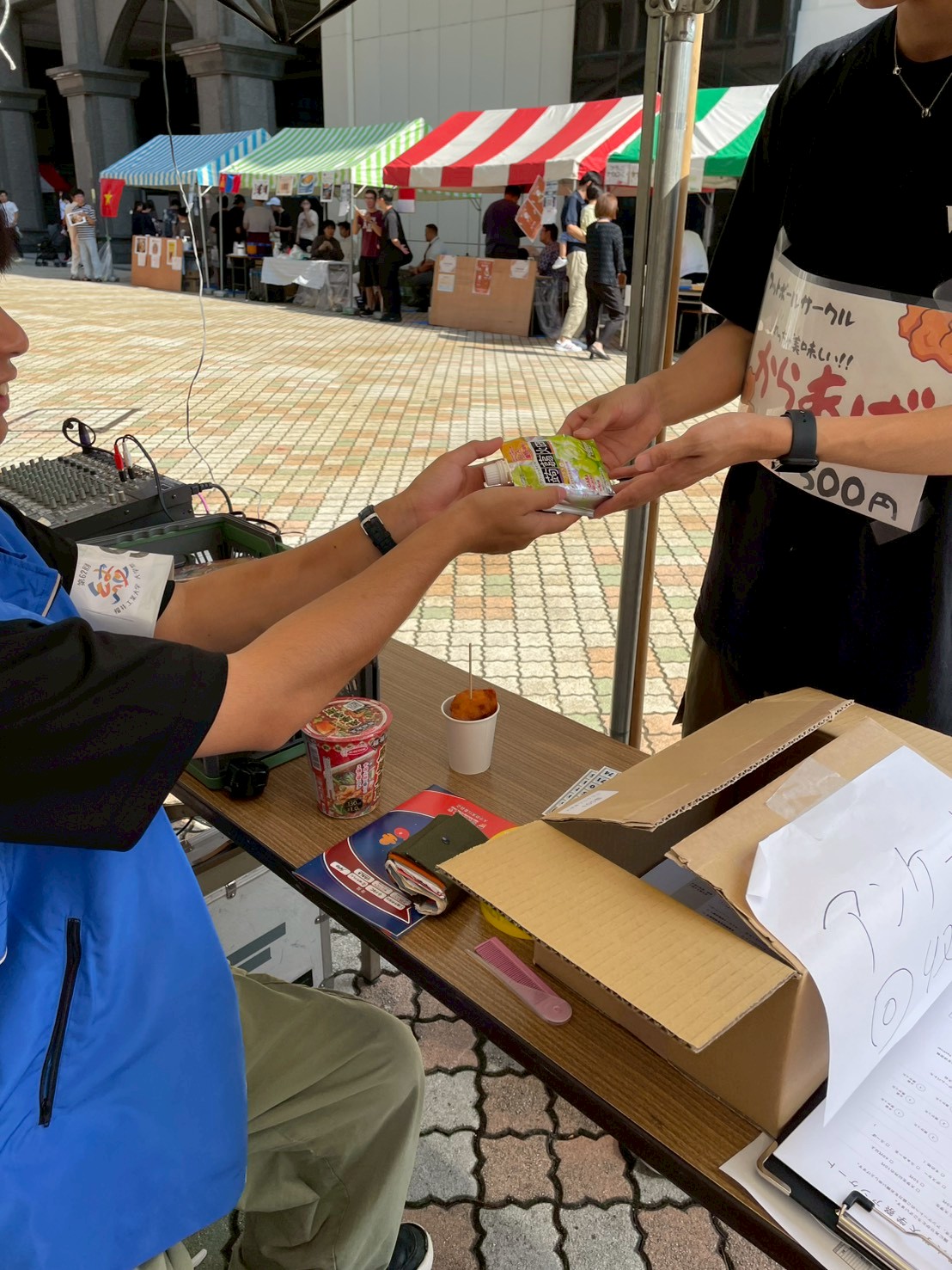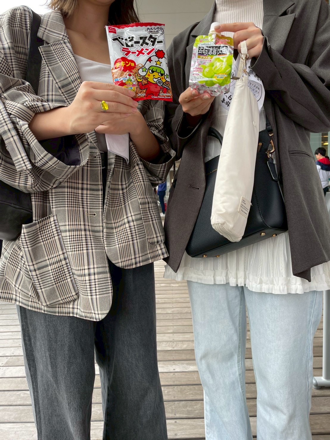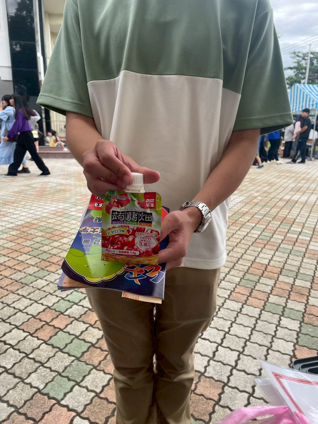 - 商品に対するコメント:ご協賛いただきました「クラッシュタイプの蒟蒻畑(マスカット味・アセロラ味)」は、来場者の皆様から非常に高い評価をいただきました。クラッシュタイプはコンパクトなパウチタイプで片手でも食べやすく、大学祭の会場を回りながら気軽に楽しんでいる方の姿も多く見受けられました。特にアセロラ味は注目を集め、「アセロラ味があることを初めて知った」「さっぱりしていて美味しい」といった声を多数いただきました。どちらの味も爽やかで、暑さの残る時期の大学祭にぴったりの商品でした。