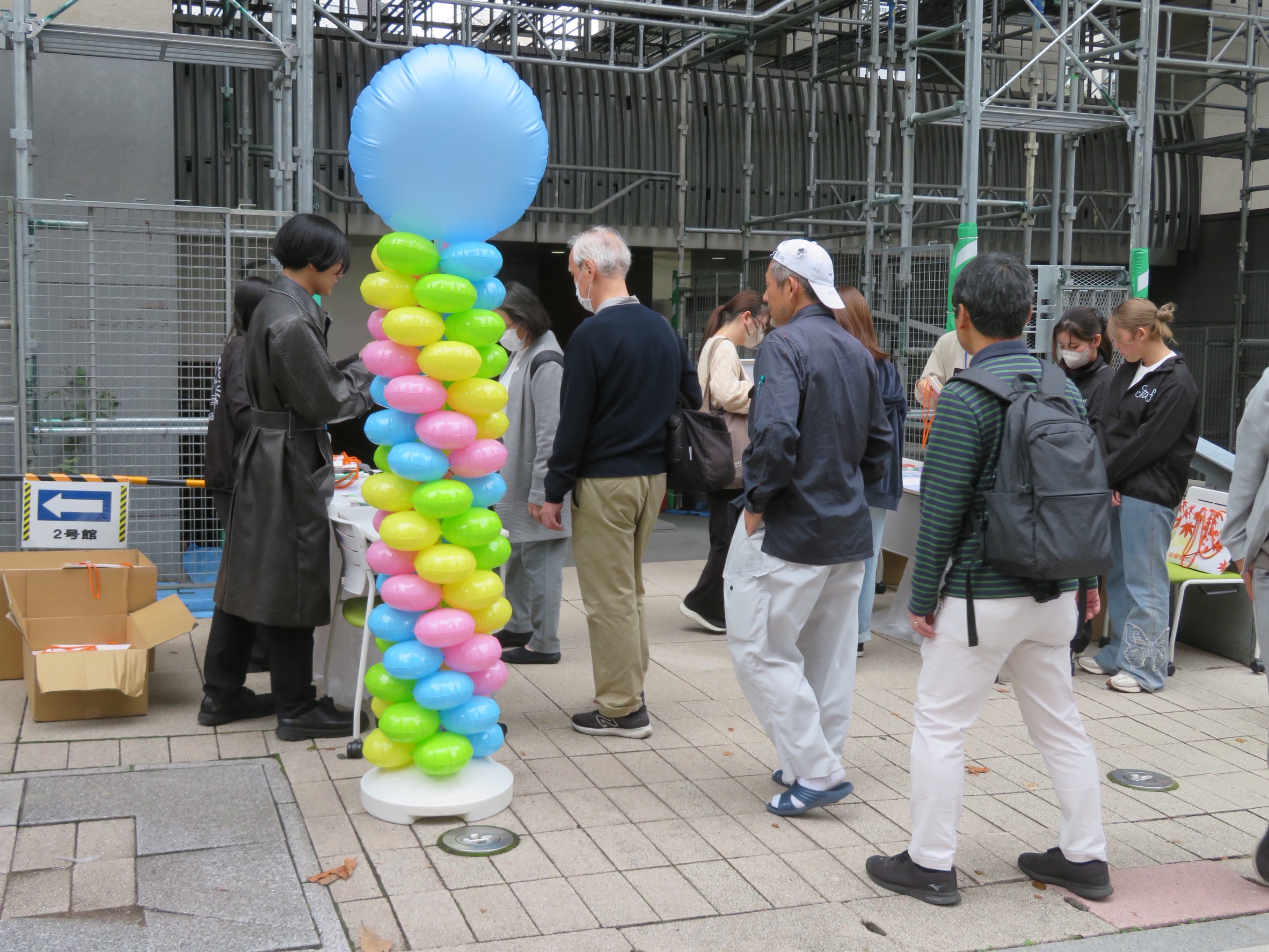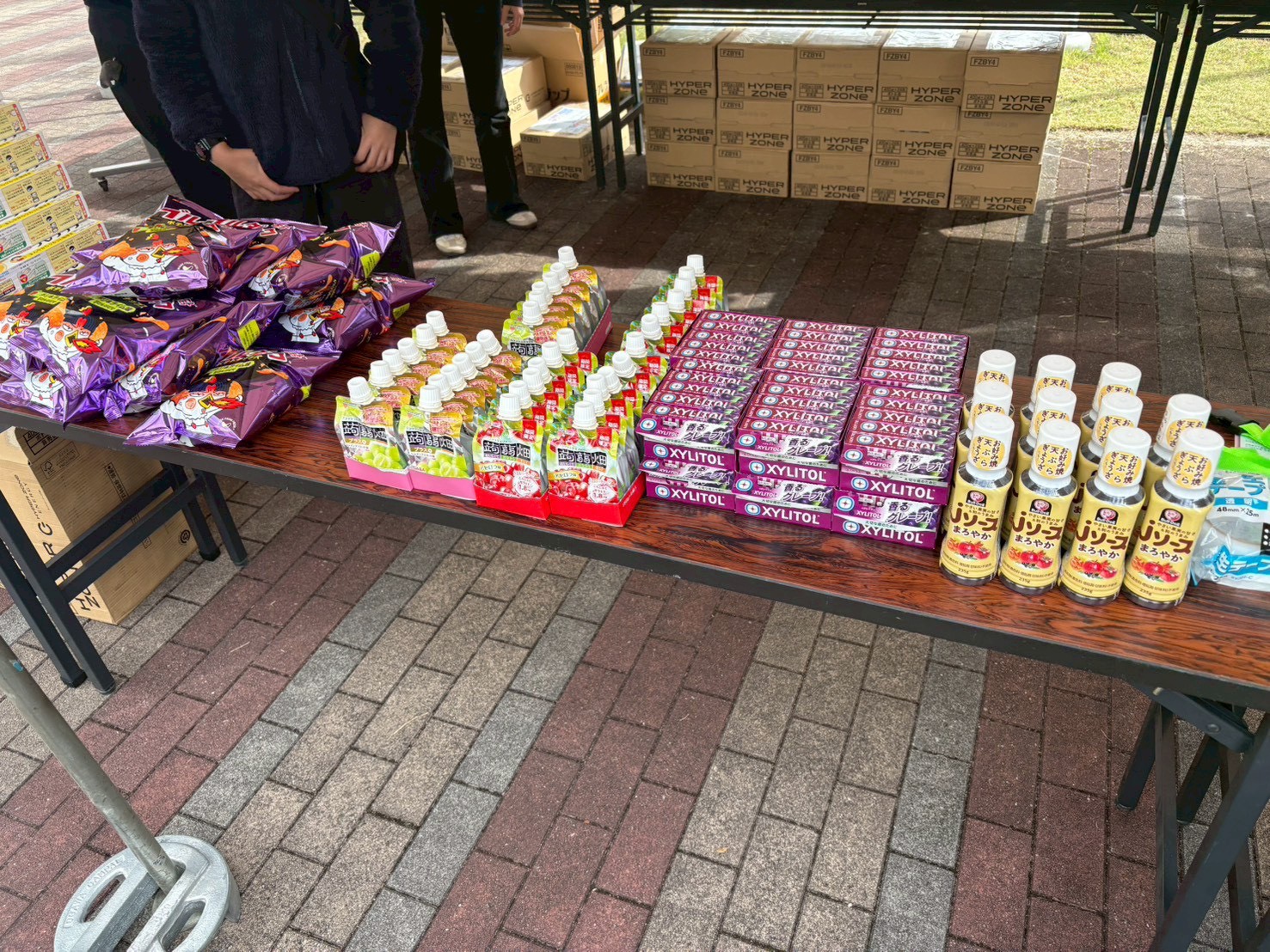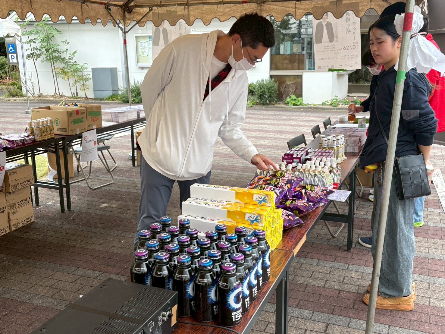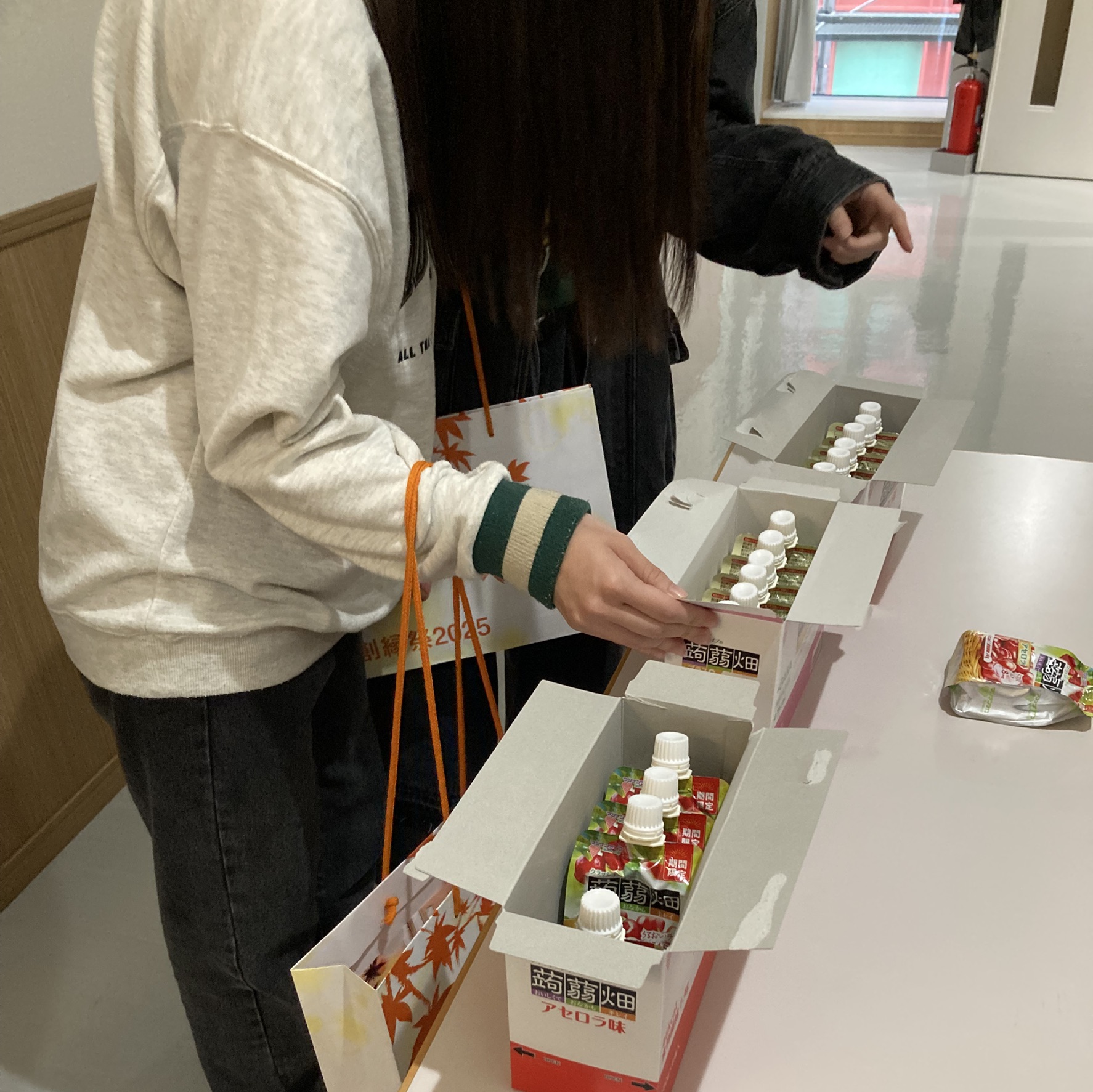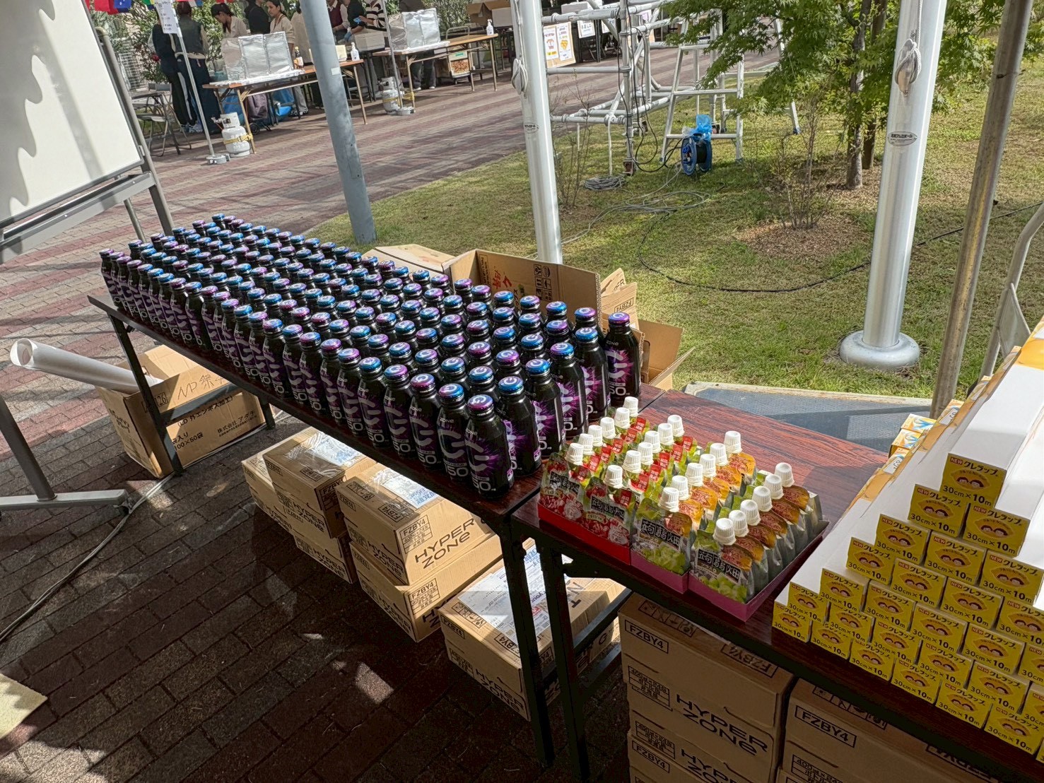 - 商品配布状況:提供いただいた「クラッシュタイプの蒟蒻畑」は、スタンプラリー企画の景品として来場者の方々にお渡しし、多くの皆さまに企画へ積極的にご参加いただくおおきなきっかけとなりました。 また、学園祭の運営に携わったスタッフや、当日に企画を担当した参加団体には功労品として配布いたしました。長時間にわたる準備・運営に取り組む中で、気軽に摂取できるリフレッシュアイテムとして大変活用され、学園祭を支える現場においても大変ありがたい提供となりました。