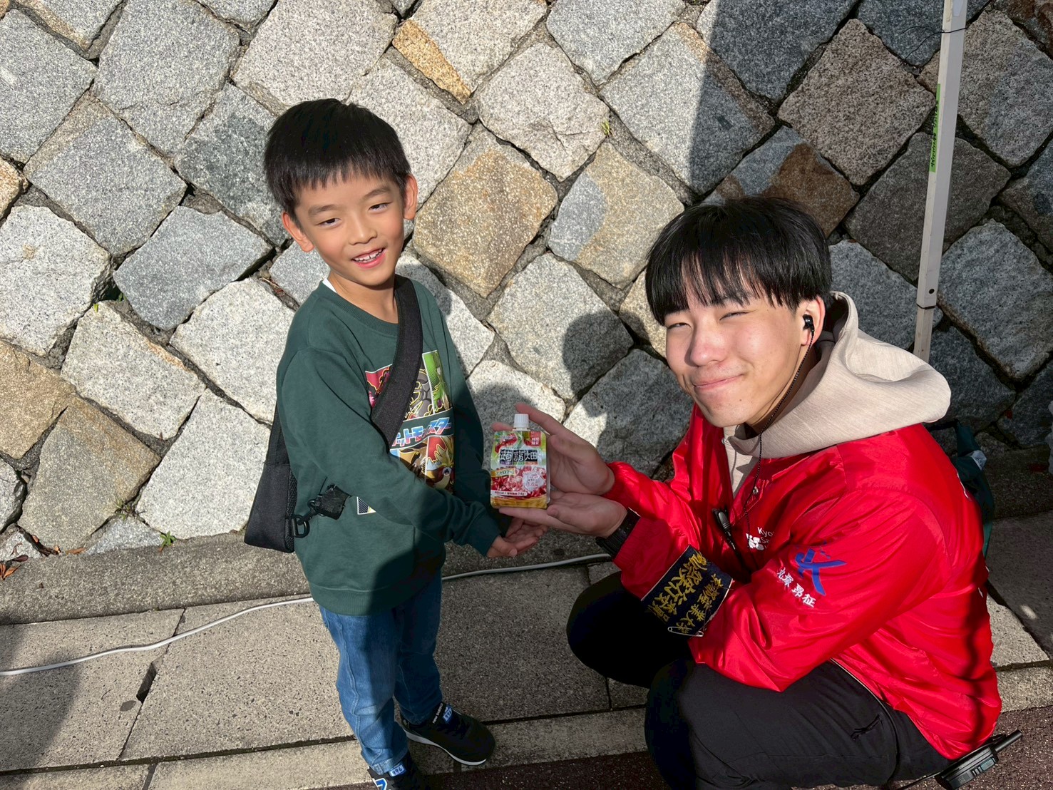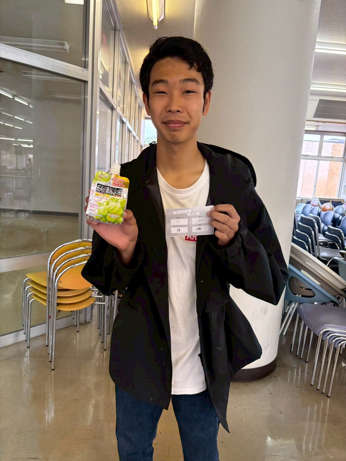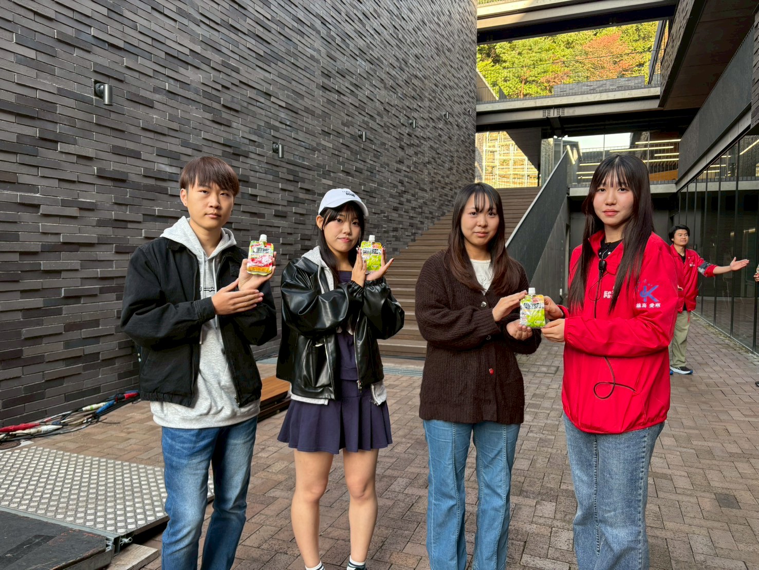 - 商品に対するコメント:提供いただいた「蒟蒻畑 マスカット味」は、特に幅広い年代の来場者から大変好評でした。手軽に楽しめる商品として、多くの方に喜ばれていました。また、小分けで配布しやすい点や、衛生的に扱える点も、学祭の運営面において非常に助かりました。休憩時間に室内企画に参加し、蒟蒻畑を選んだ学生スタッフに、味の感想を聞きましたが「食べ応えがあり満足感がある」「味がしっかりしておいしい」といった声が多く寄せられました。提供いただきました商品は、学祭の盛り上がりに大きく貢献いたしました。