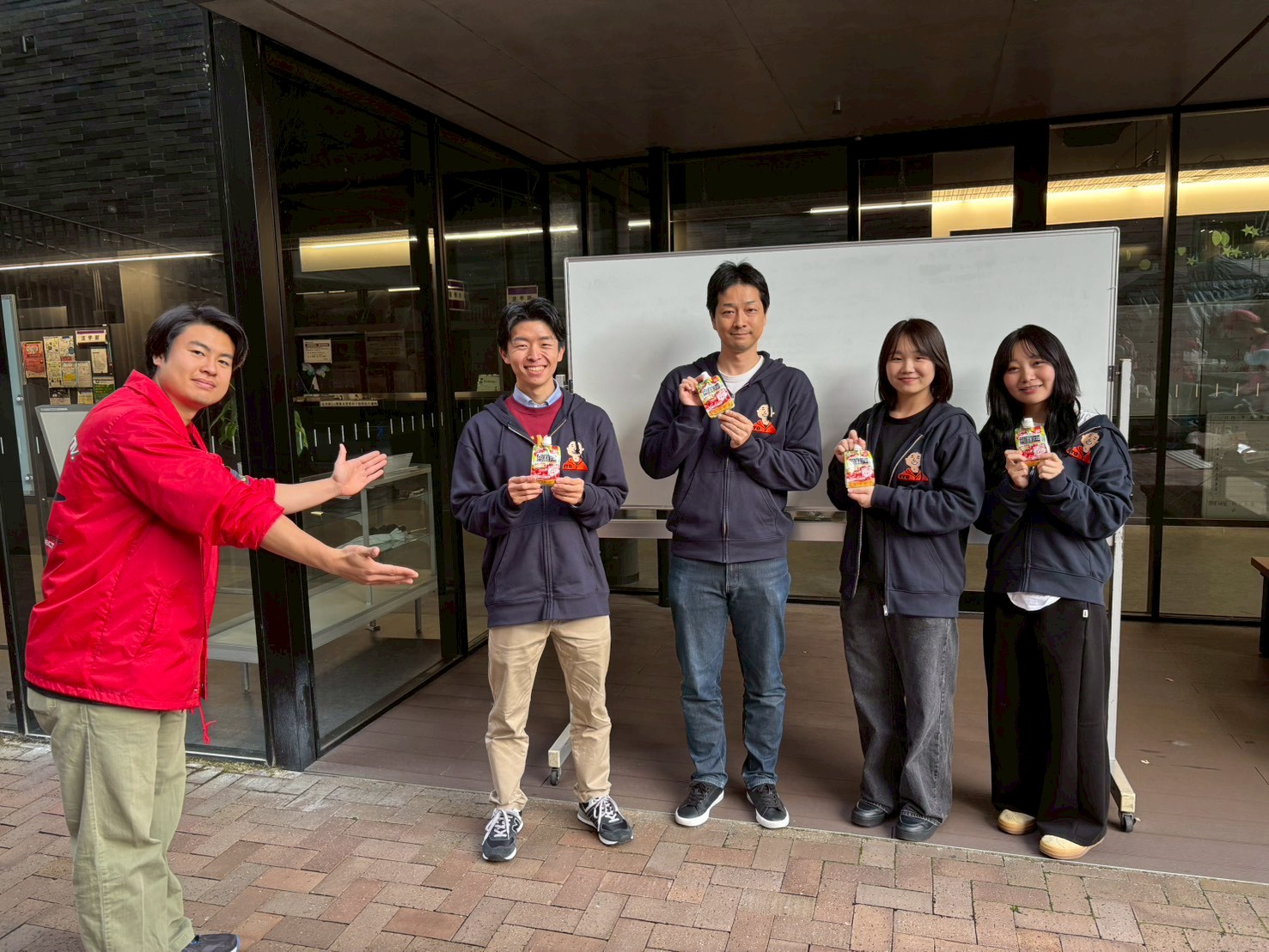 - 商品配布状況:本年度の学祭では、提供いただいた「蒟蒻畑 マスカット味」を主に室内企画にて来場者へ配布いたしました。具体的には、お化け屋敷の退出後や、複数のミニゲームを楽しめる「ゲームゲート」での参加特典として、また、謎解きゲーム終了後にもお渡しし、企画参加者の満足度向上に大きく寄与しました。複数のご協賛品が並ぶ中でも、多くの方が「蒟蒻畑」を選び手に取られており、高い人気が見られ、全て配布させていただきました。雨天の影響により屋外の人流が限られた状況でも、室内企画には多くの来場者が訪れ、商品は幅広い年代の方に受け取っていただくことができました。小分けで扱いやすく、運営面でも配布が円滑に進みました。