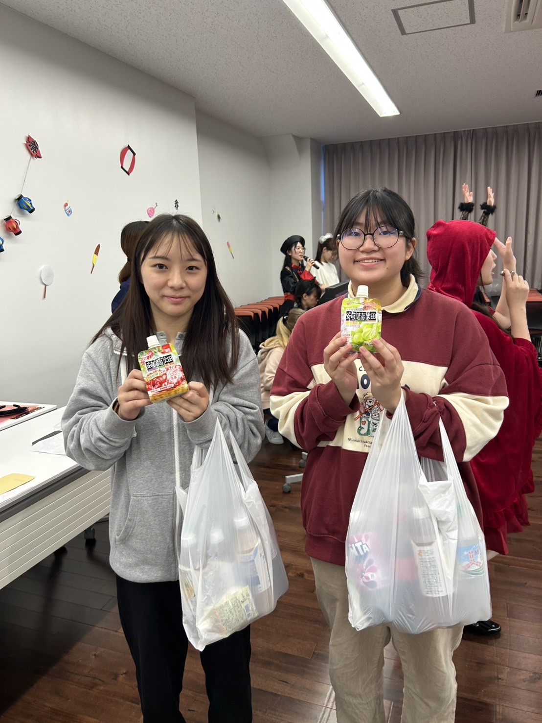 - 商品に対するコメント:クラッシュタイプの蒟蒻畑のアセロラ味とマスカット味をいただき来場者に配布したところ、受け取った学生からは朝ごはんや空いた時間に食べる軽食として活用したいという声がありました。キャップがついているため、一気に全て食べずに少しずつ食べるができるのが嬉しいです。また、普段からよく購入して食べているが(ぶどう味やりんご味)、いつもは選ばない味であったので初めて食べたけど美味しかったという声もありました。
