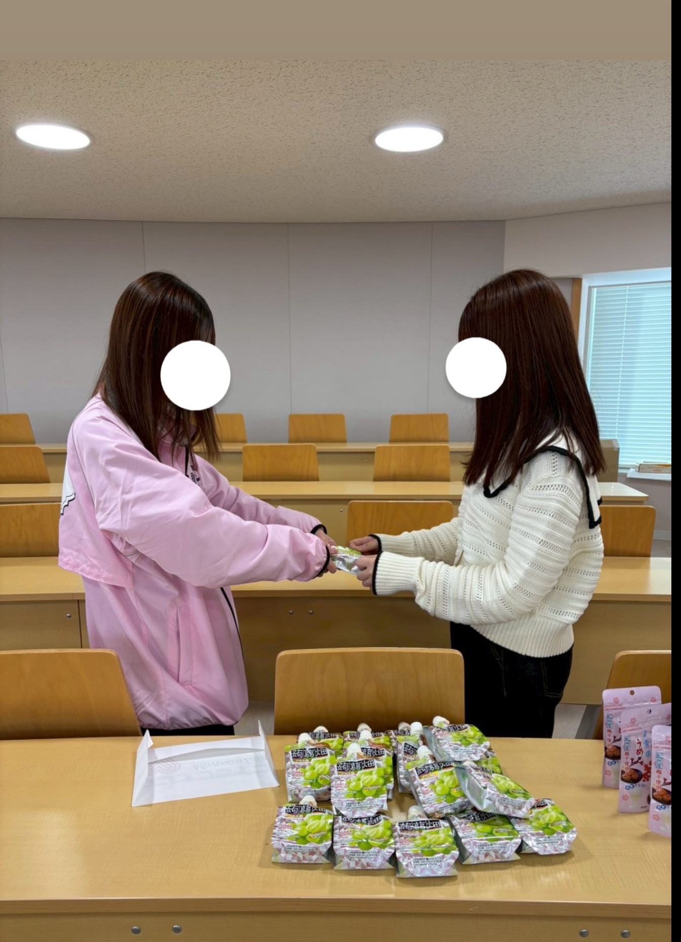 - 商品に対するコメント:提供いただいた、蒟蒻畑のアセロラ味とマスカット味は、どちらもパウチタイプで手軽に食べられるため、来場者の方々にとって受け取りやすい商品でした。配布の際には、多くの来場者の方が蒟蒻畑を見つけて「食べたい!」と声を上げ、嬉しそうに手に取る様子が見られました。来場者の方にはアセロラ味とマスカット味の両方をお渡しし、アセロラ味については「さっぱりしていて食べやすい」、マスカット味については「甘くておいしい」との声が聞かれ、子どもを中心に手軽に食べられ、味わっていただける様子も多く見られました。どちらも蒟蒻特有の弾力ある食感があり、噛むことで食感を楽しめる点も好評でした。幅広い年代の方々に手軽に受け取っていただけるパウチタイプであることも喜ばれ、両方の味を楽しめることで来場者が学園祭をより楽しむきっかけとなりました。