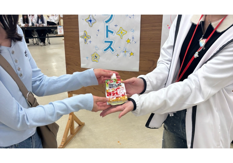 - 商品に対するコメント:毎年、私たちの学園祭には家族連れや若者など幅広い世代の方々が来場されますが、長年多くの人に親しまれている蒟蒻畑をお渡しできたことをとても嬉しく思っております 。 手軽に食べられる商品でありながら、健康的で安心感のある点も魅力的で、幅広い年代層が参加する当学園祭の来場者への景品としてぴったりでした。 実際に、景品を受け取って直ぐに食べているお子様もいました。 学園祭の明るくにぎやかな雰囲気にもよく合い、皆さまに喜んでいただける協賛品となりました。