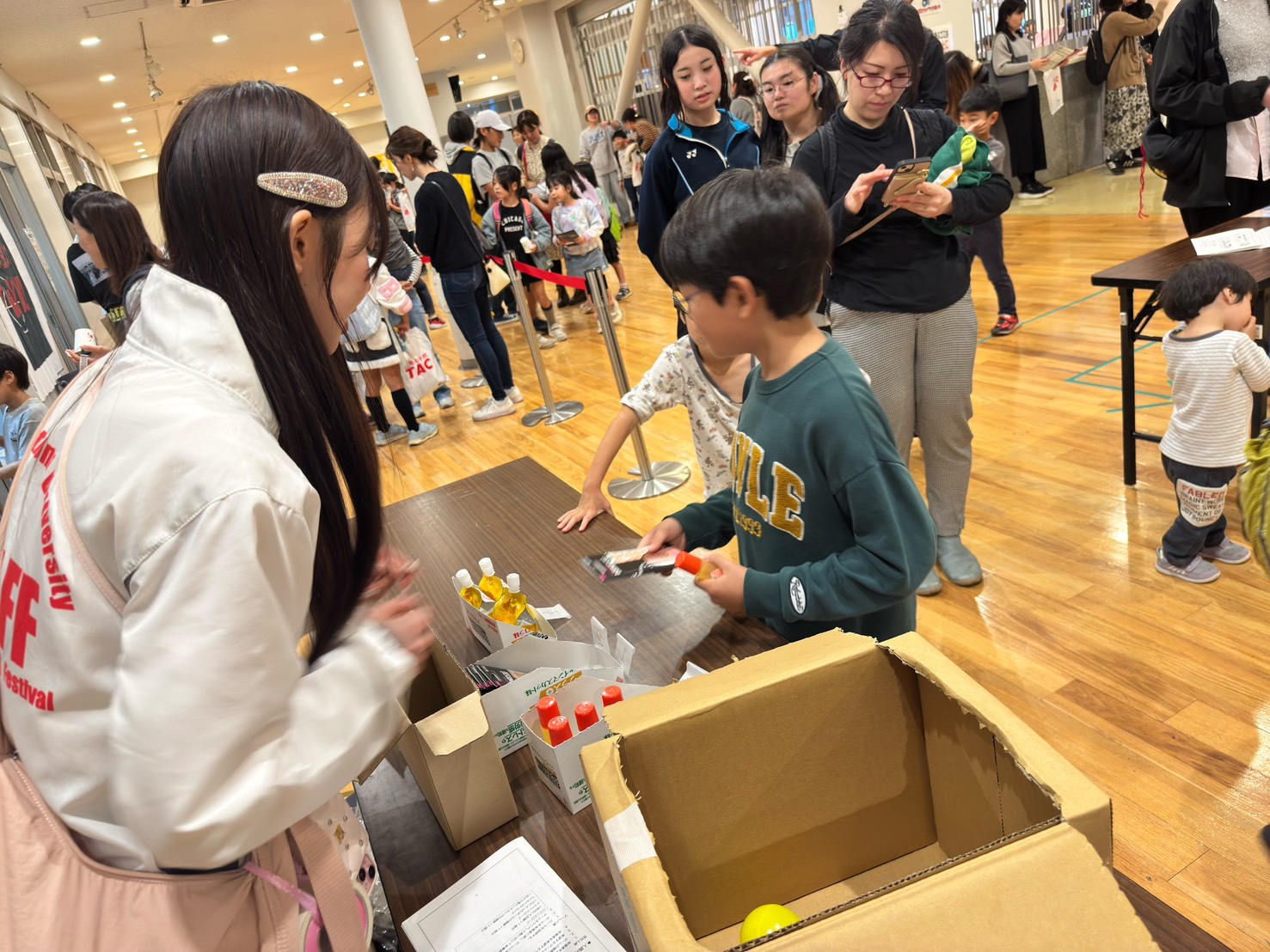 - 商品配布状況:今年度の学園祭では、毎年大人気のテーマパーク企画やカジノ企画の景品として、提供いただいた「蒟蒻畑」を配布いたしました。 各企画ブースでは多くの来場者が集まり、景品として蒟蒻畑を受け取られた方々がとても喜ばれている様子が見られました。 商品を通じて多くの方に笑顔をお届けできたと感じております。 両日とも来場者数は非常に多く、特に家族連れや若者を中心に幅広い層の方々に商品が行き渡り、企業名および商品名のPRにも大きくつながりました。配布の際には受け取った方々の笑顔が多く見られました。