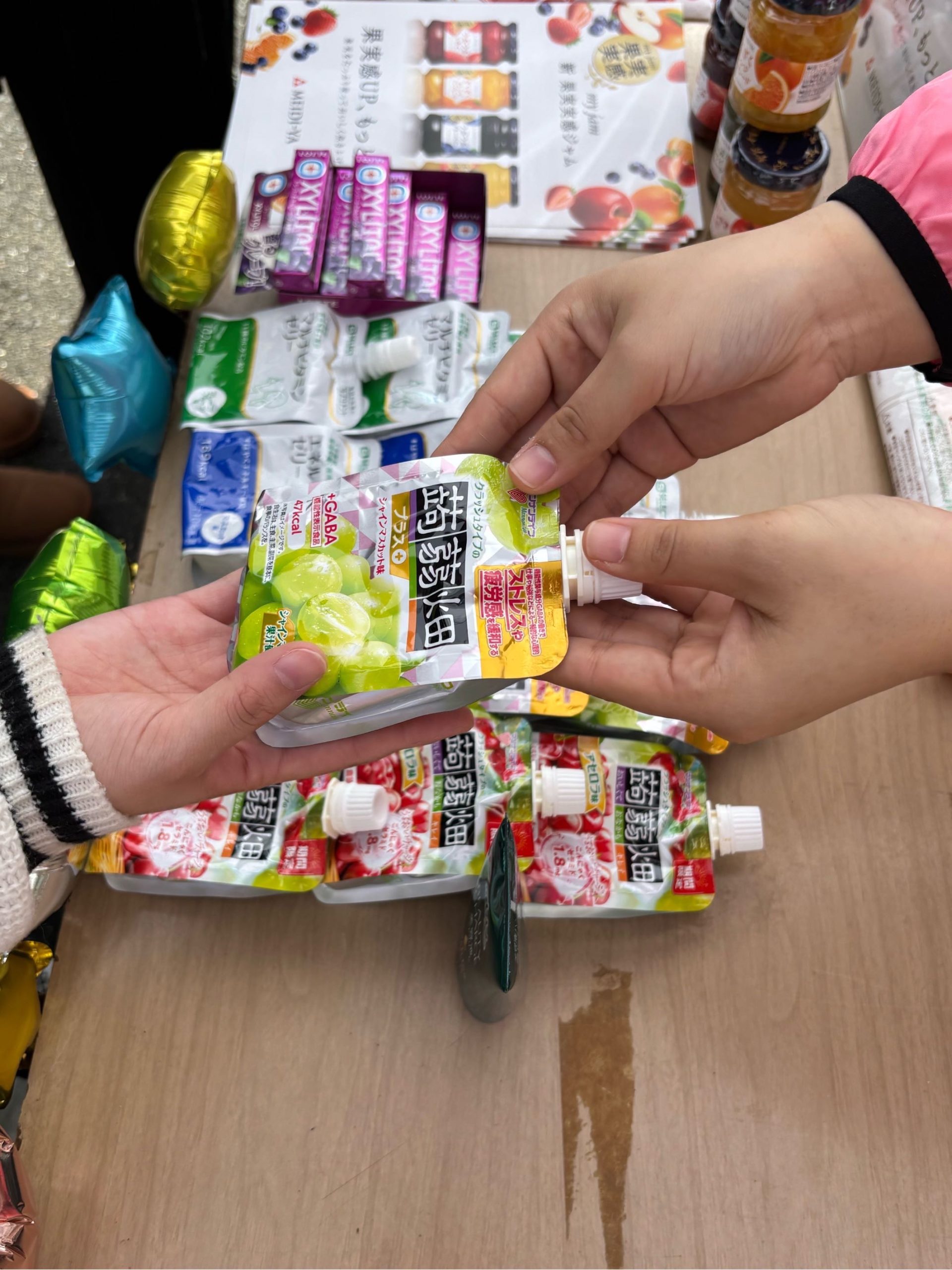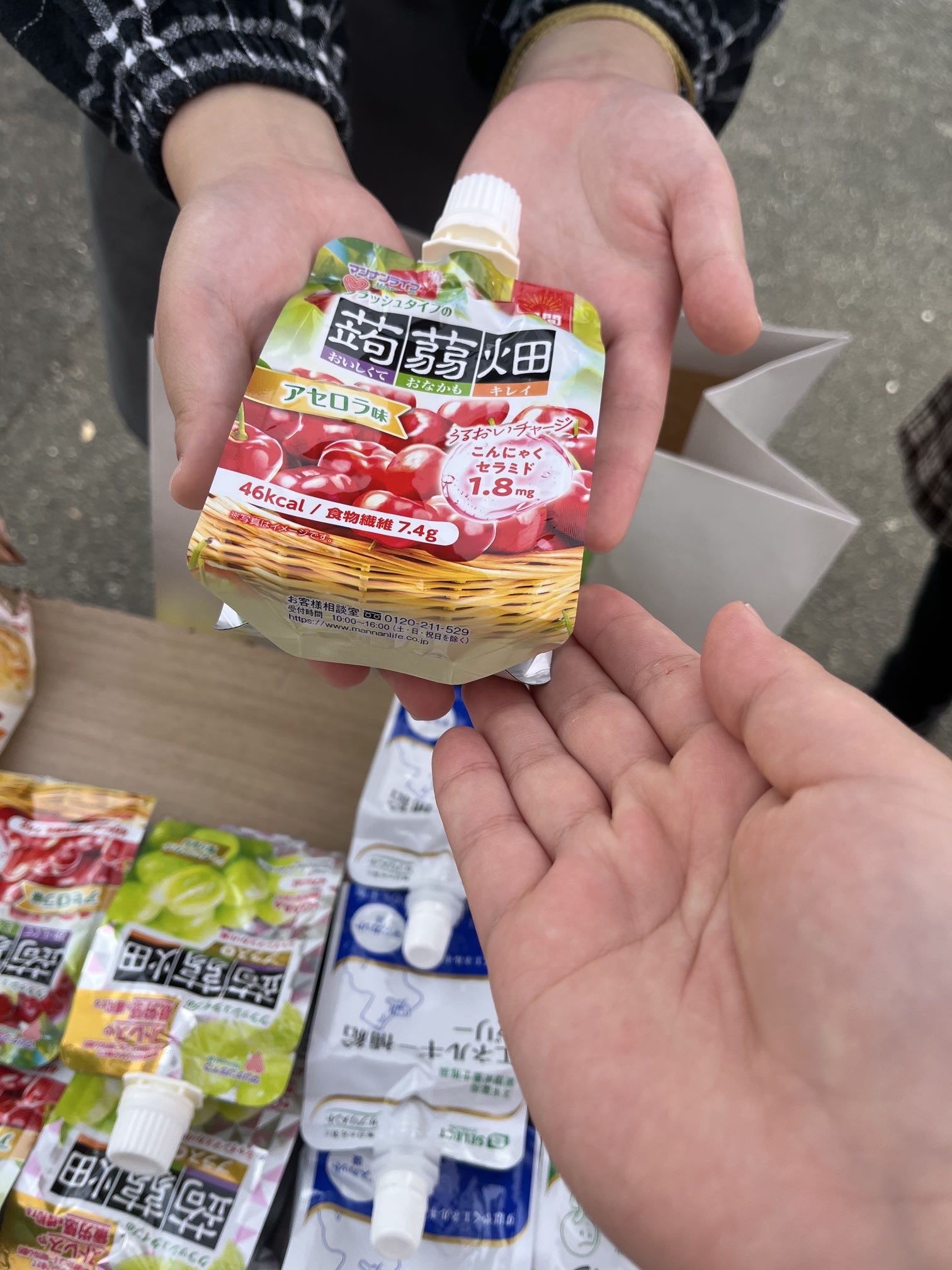 - 商品配布状況:提供いただいた「蒟蒻畑(マスカット味、アセロラ味)」を来場者特典として1人につき、ひとつ配布いたしました。受付時に手渡しする形式をとることでたくさんの方にお届けすることができ、蒟蒻畑は大学祭の”おもてなし”の一環として大変喜ばれました。手軽に食べられるサイズ感と、さっぱりとした味わいが屋外イベントにぴったりで、「気軽に楽しめる」「子どもも安心して食べられる」といった声も多く寄せられました。来場者の笑顔を引き出す、印象的な特典となりました 。