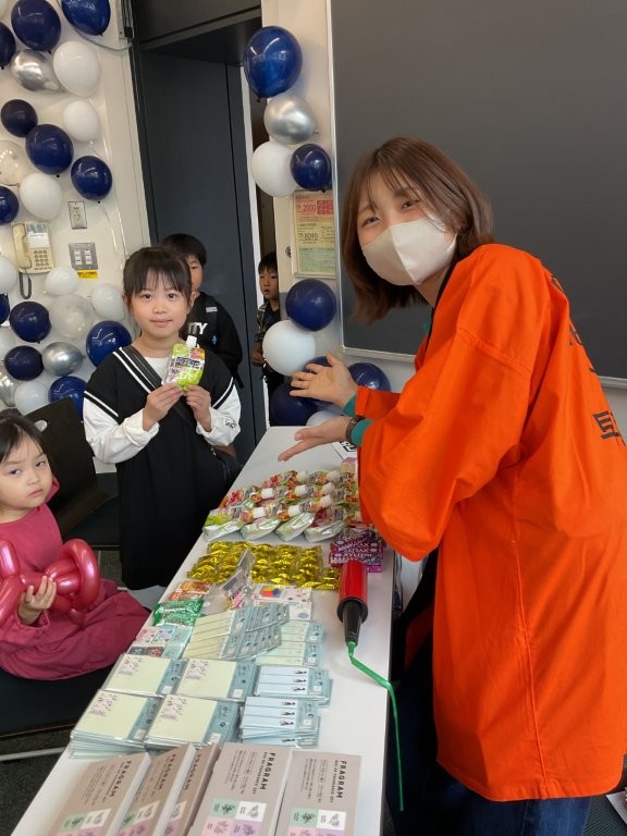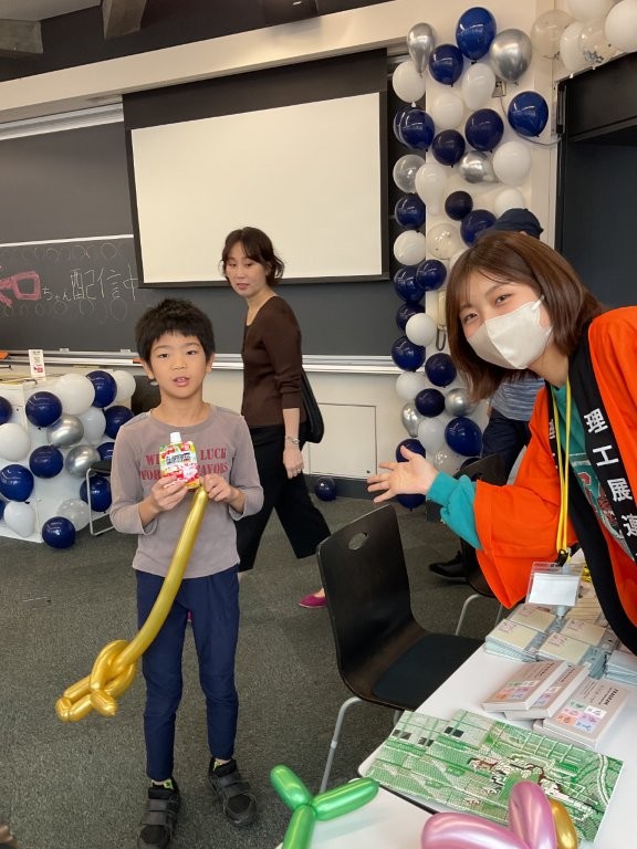 - 商品配布状況:本年度はウォークラリー企画、バルーンアート企画、縁日企画、実験企画などの景品として使用させていただきました。主に子供たちにとても人気な商品でした。 「ウォークラリー」では、スタンプラリー形式でキャンパス内を巡るイベントに2日間で342組(415名)の方が参加し、ご協賛企業様からご提供いただいた景品を抽選場所にて配布いたしました。景品を受け取られた来場者の皆様からは、喜びの声が多数寄せられました。 「バルーンアート企画」では、主に理工展公式マスコットキャラクター「矢口くん」と伴に校内を歩き、子供たち向けの目の前でバルーンを作成し、プレゼントしました。 いただいた協賛品は、もらいに来た子や自分で作るのに挑戦した子にプレゼントしました。 「理工縁日」では主に親子連れの方に輪投げやボールすくいなどのゲームを実施しました。いただいた協賛品はすべてのゲームに一定以上の成績を収めた方に対して景品として配布しました。 「Alice in WonderLab」では主に子供たちに実験の楽しさを体験してもらうことを目的に実施しました。実験を通して科学の楽しさを実感してもらうことができました。いただいた協賛品は実験を行った子供たちに対して景品として配布しました。