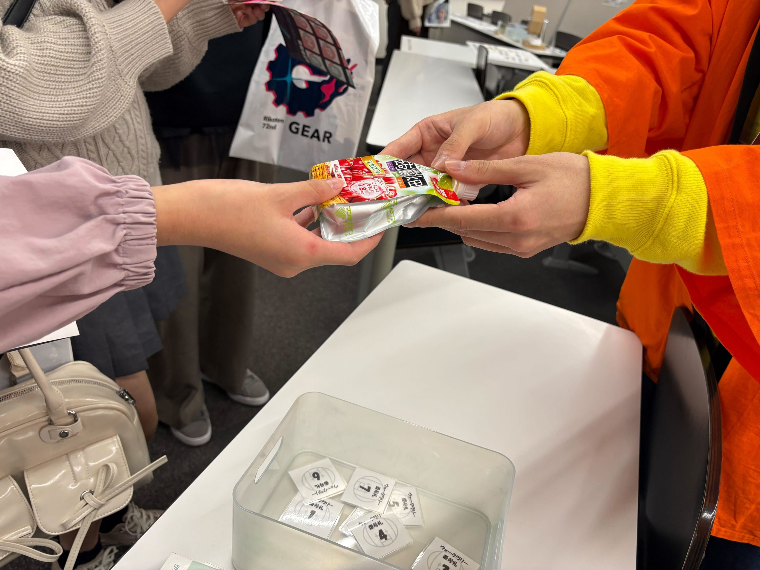 - 商品に対するコメント:老若男女問わず多くの方に喜んでいただき、特に幼いお子さまからは大変好評をいただきました。パッケージも持ち帰りやすく、屋外でも食べやすい形状で、景品として配布 した際にも「受け取ってすぐ楽しめる」という点が評価されました。味はシャインマスカットとアセロラの2種類をご用意していただきましたが、中でもより一般的でイメージのしやすいシャインマスカットを手に取る方が多い印象でした。景品としてお渡ししたため実際の味の感想までは確認できていませんが、受け取った瞬間の反応からも高い満足度につながったと感じています。