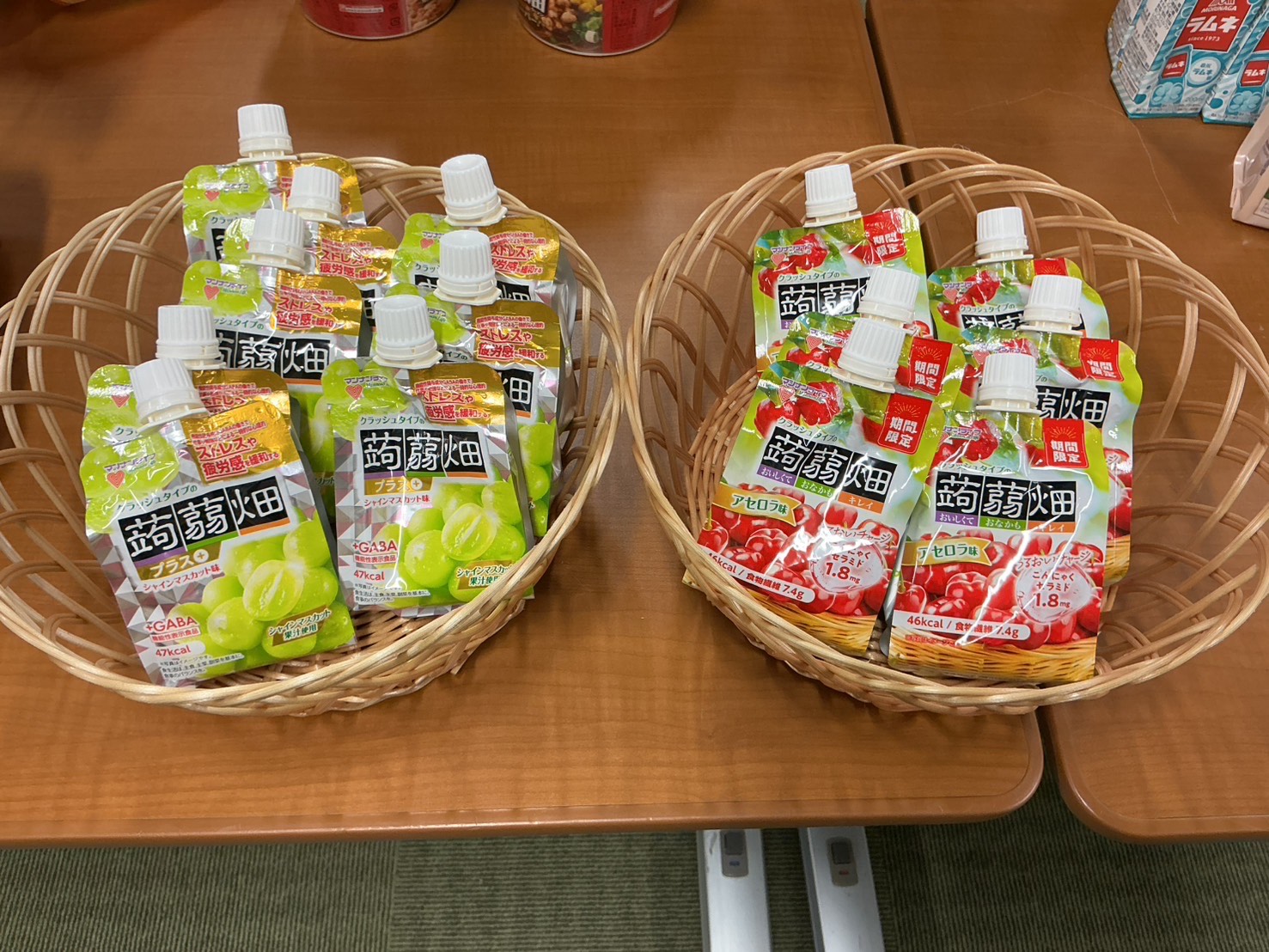 - 商品に対するコメント:クラッシュタイプの蒟蒻畑を協賛いただきました。 本商品は、クラッシュゼリーの食感とキャップ付きパウチの手軽さが特徴で、活動の合間でも飲みやすい点が特に好評でした。 今回ご提供いただいたシャインマスカット味は爽やかな甘さで、GABAが配合されていることから、緊張や疲れを感じやすい出演者にも喜ばれました。また、期間限定のアセロ ラ味は「珍しい」「美味しそう」といった声が多く、来場者の注目を集めていました。 実用性に加えて味の楽しさや話題性も兼ね備えた協賛品であり、多くの人にとってリフレッシュとなる協賛品でした。