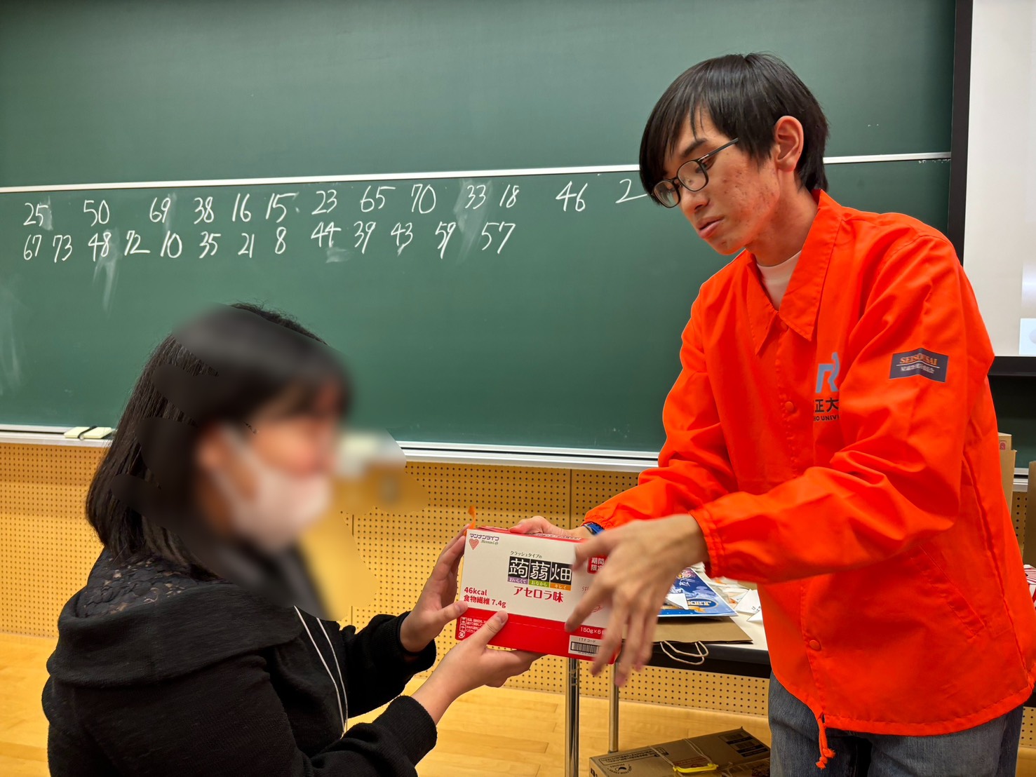 - 商品配布状況:提供いただいたクラッシュタイプの蒟蒻畑は、大講堂企画の出演者用ケータリングや、脱出ゲーム企画での景品として活用いたしました。 出演者にとっては、リハーサルや本番前後の短い休憩時間でも手軽に栄養補給ができる点が大変好評でした。また、脱出ゲーム企画においては、参加特典やクリア景品として 配布したことで、参加意欲を高める効果が見られ、多くの来場者が足を運ぶきっかけとなりました。 2日間を通して協賛品は計画的かつ効果的に使用され、多くの参加者に喜ばれる結果となりました。