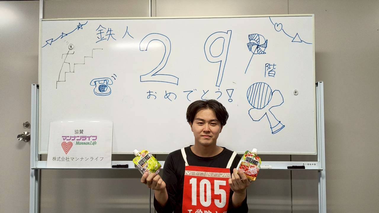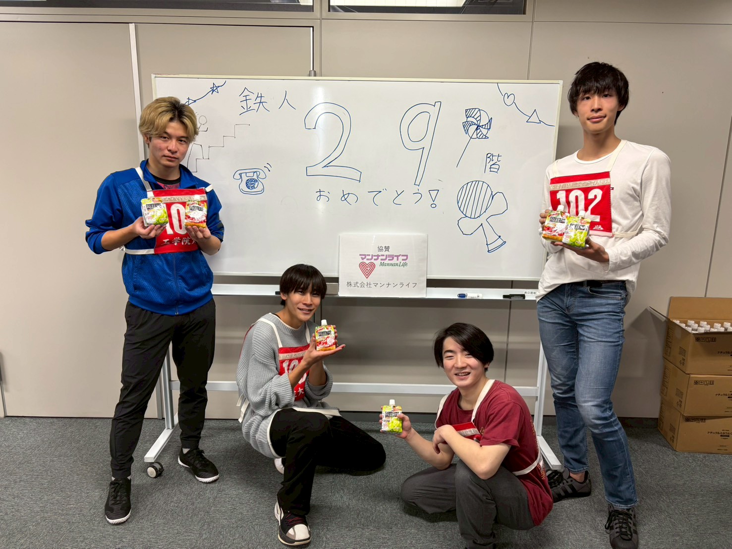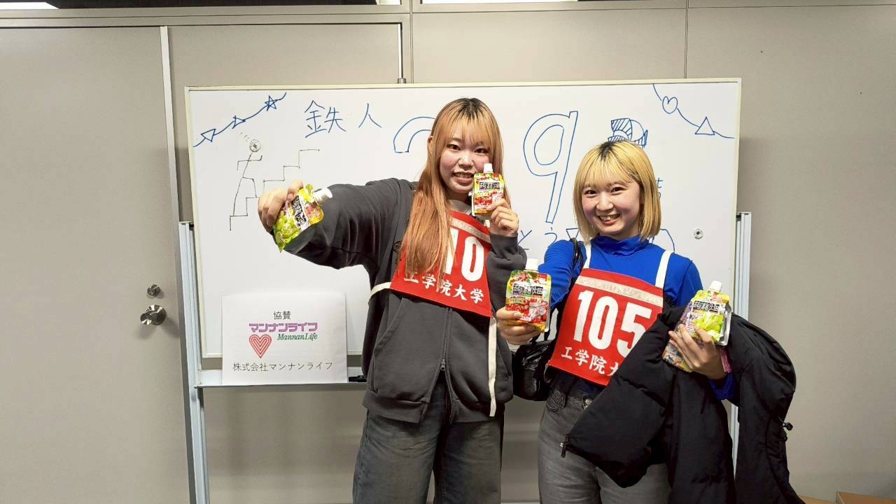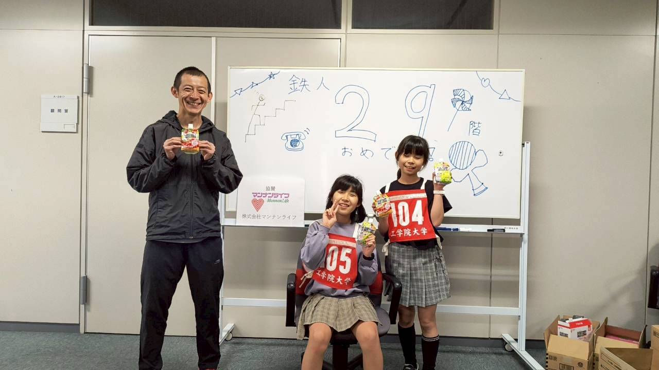- 商品配布状況:商品の配布のやりかたに関しては工学院大学の新宿祭の目玉イベントの一つの鉄人29階というイベントで配布しました。このイベントは新宿キャンパスの特徴である高層ビルという点を生かした29階まである階段を駆け上がる階段ダッシュイベントです。このイベントで優秀なタイムを残した参加者に特別な景品として協賛品を配布させていただきました。このイベントはとても人気のイベントのためこのイベントで頂いたすべての商品を配布させていただきました。