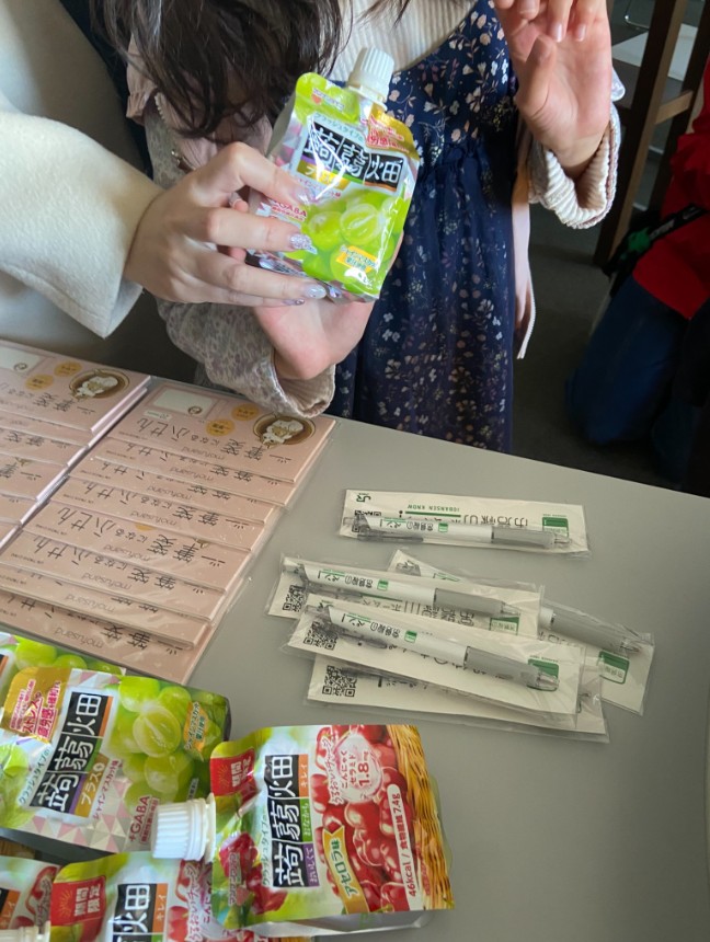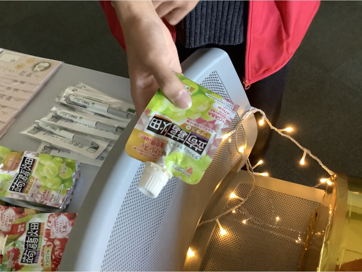 - 商品に対するコメント:配布した商品に対するコメントで多かったのは2種類ともとても食べやすく味がとてもおいしいという感想をとてもたくさんいただきました。その中で特にシャインマスカット味のクラッシュタイプの蒟蒻畑は機能性関与成分GABAの働きで仕事や勉強などによる一時的な心理的ストレスや疲労感を緩和するという効果があるため運動などをよくする学生からとても高い評価をしていただきました。2種類とも小さな子供から大人まで幅広い年代の方からとてもいいコメントを頂き商品をもらった来場者のかたがとても満足した表情をしていました。