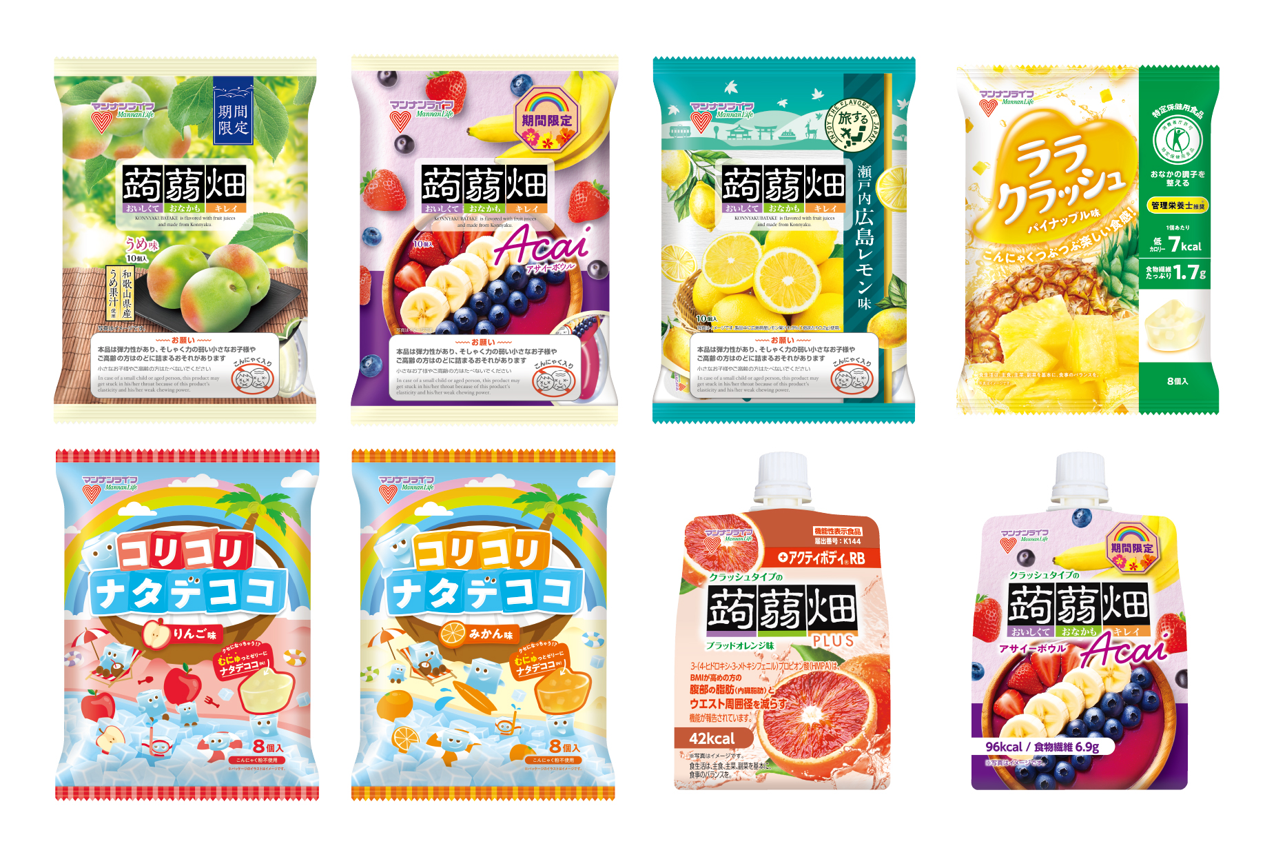3月2日(月)に「蒟蒻畑 うめ味」「蒟蒻畑 アサイーボウル」「蒟蒻畑 瀬戸内広島レモン味」「コリコリナタデココ みかん味」「コリコリナタデココ りんご味」「(特定保健用食品)蒟蒻畑ララクラッシュ パイナップル味」「(機能性表示食品)クラッシュタイプの蒟蒻畑プラス ブラッドオレンジ味」「クラッシュタイプの蒟蒻畑 アサイーボウル」を全国で発売いたします。